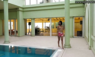 Diminutive teen fucked in the pool, indoors and swallows the cumshot