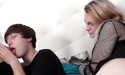 blondie de tetas grandes aplasta crossdresser con inmensa correa de consolador